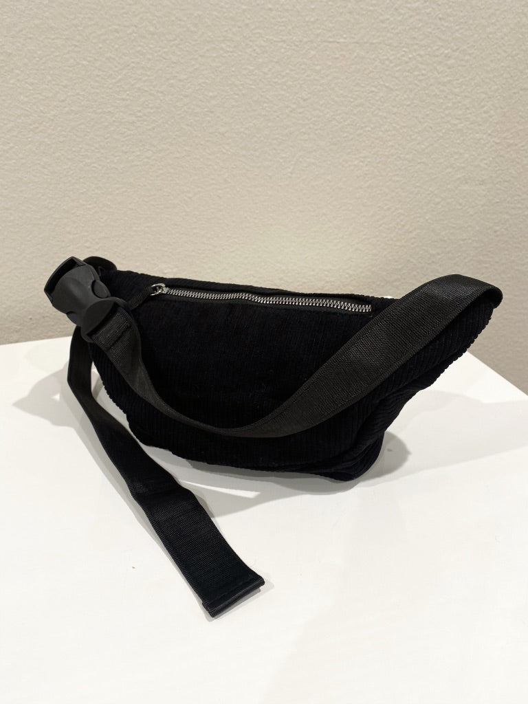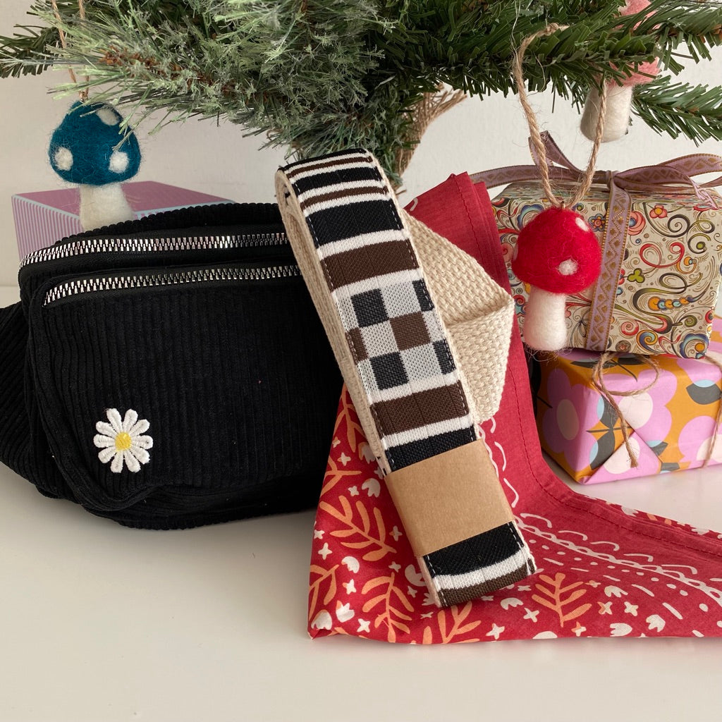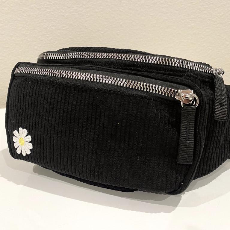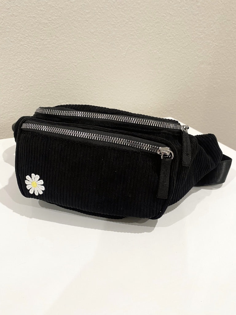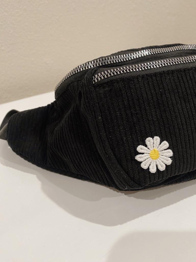 Sturdy three compartment corduroy fanny pack with small daisy patch. 🌼